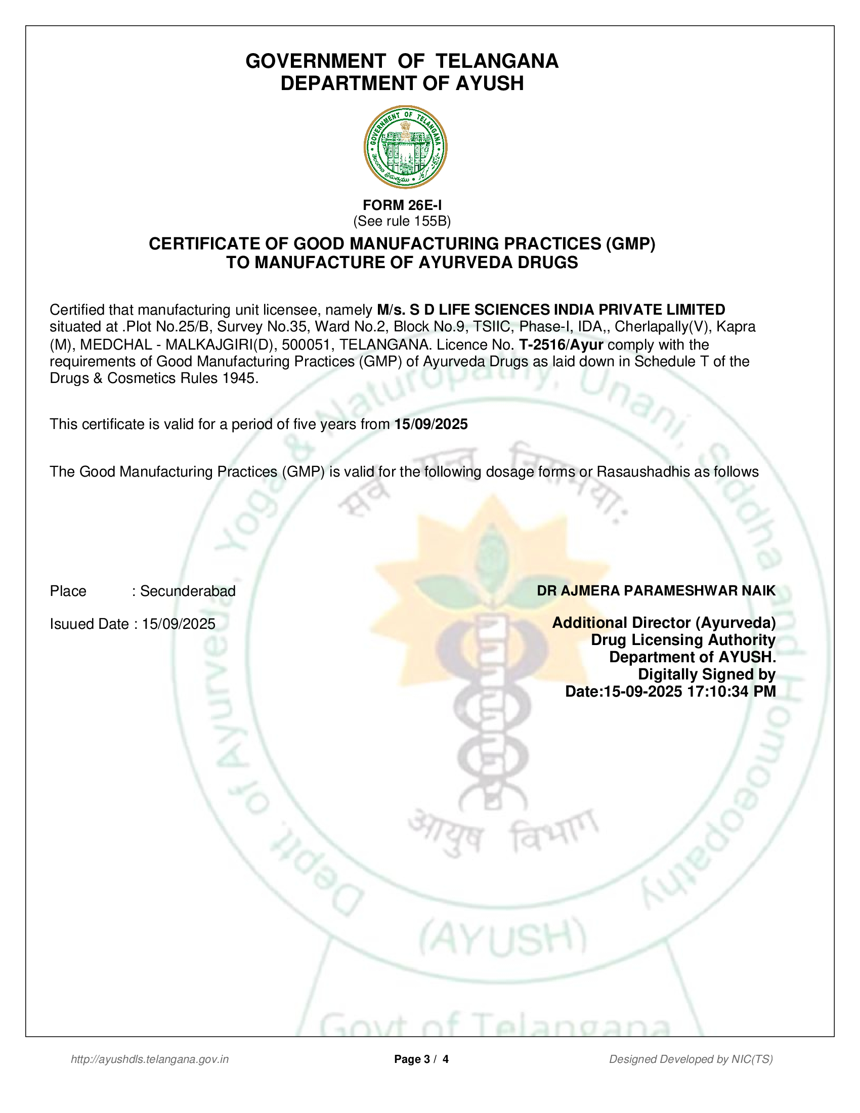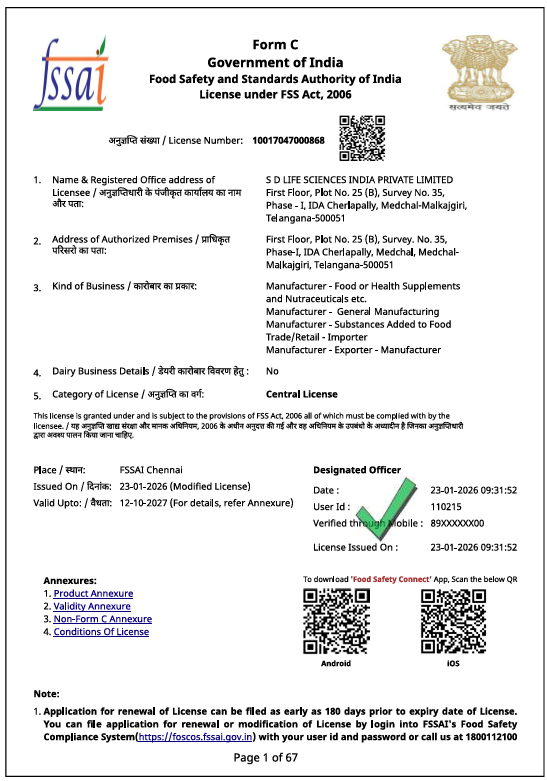 Licensed by the Food Safety and Standards Authority of India (FSSAI) under the Food Safety & Standards Act, 2006. This central license authorizes the manufacturing and distribution of nutraceuticals, health supplements, and food products in compliance with Indian food safety regulations.