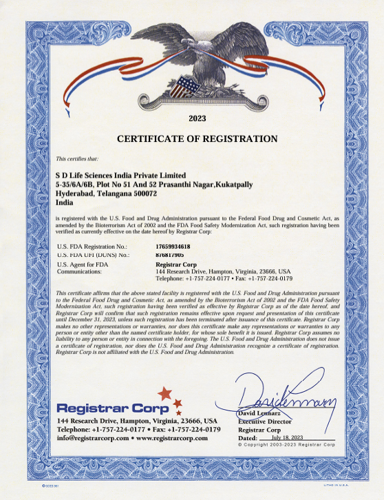Registered with the U.S. Food and Drug Administration under the Food Safety Modernization Act and the Bioterrorism Act. This registration validates the facility’s compliance with manufacturing and exporting products to the United States market.