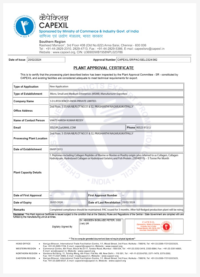 Plant Approval Certificate issued by CAPEXIL (Ministry of Commerce & Industry, Govt. of India), confirming that the manufacturing facility meets required technical standards for export. The plant has been inspected and approved as a compliant MSME manufacturer-exporter with adequate infrastructure and processing capabilities.