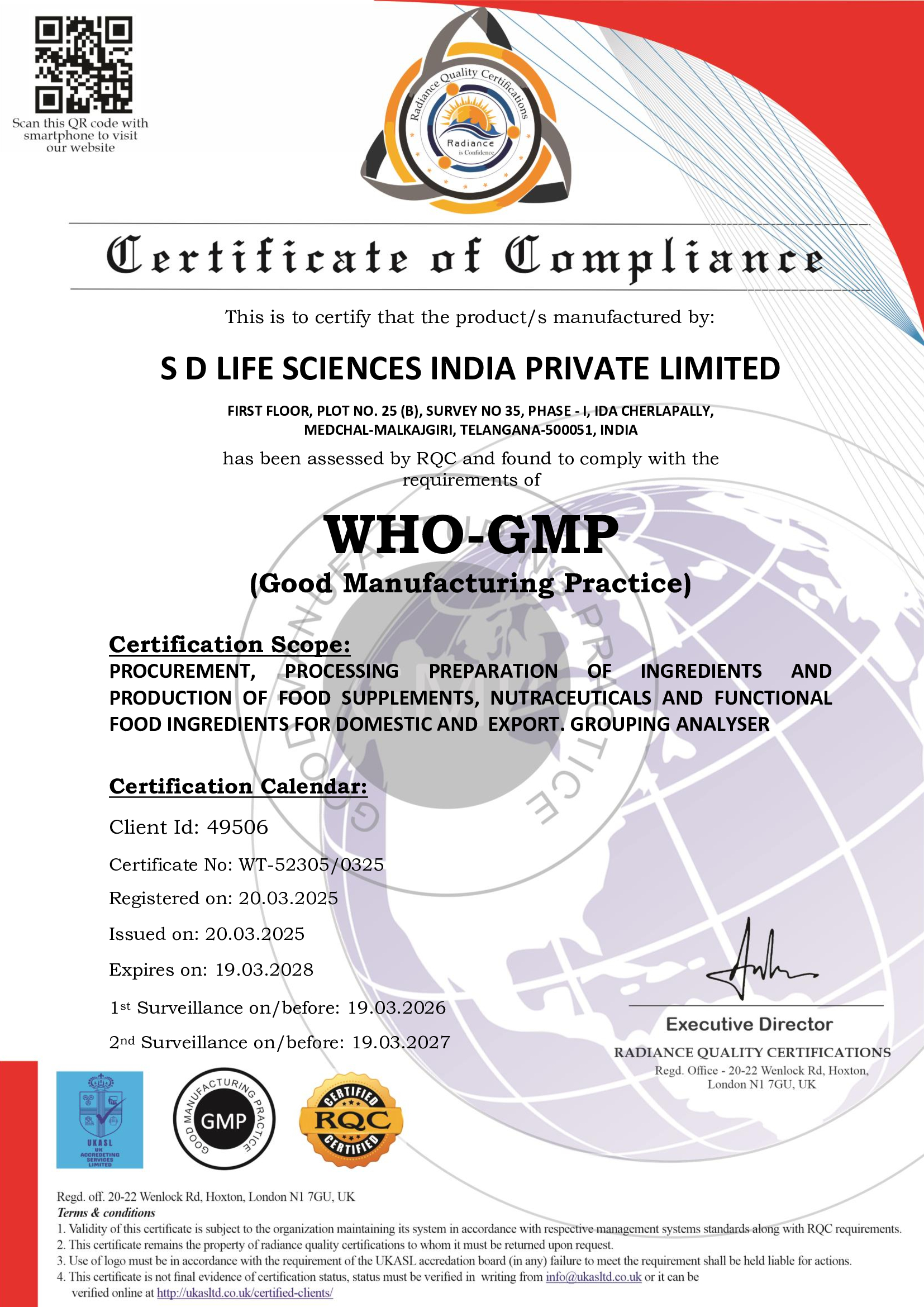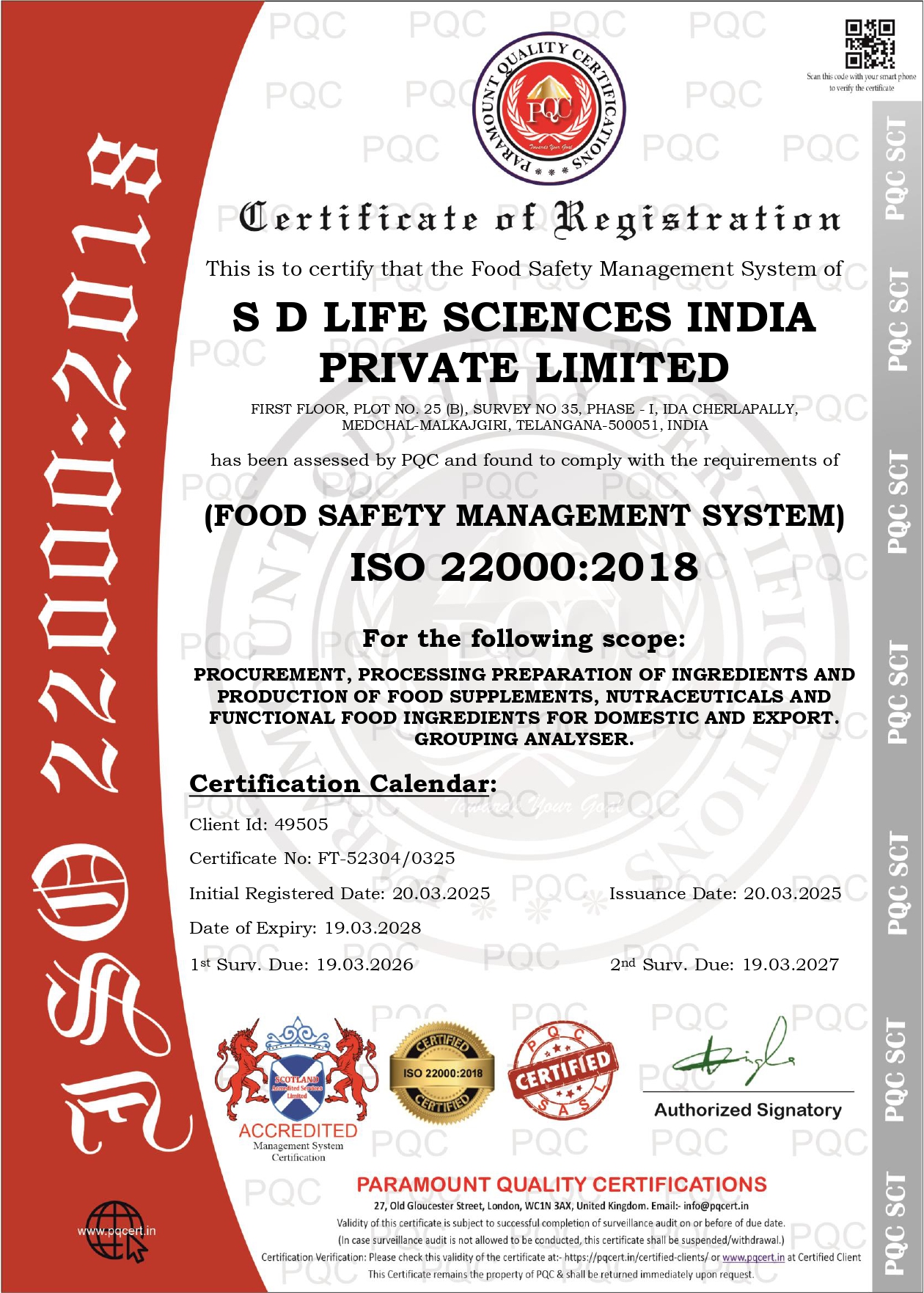 Certified for ISO 22000:2018 Food Safety Management System, covering procurement, processing, preparation of ingredients, and production of nutraceuticals, food supplements, and functional food ingredients for domestic and export markets. Certification ensures strict adherence to global food safety and quality standards.